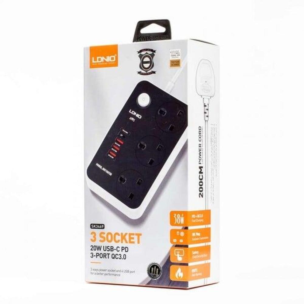 توصيلة كهرباء سلك التوصيله 2 متر ماركة LDNIO توصيله ب 3 افياش كهربائية تقبل مختلف أنواع المداخل وبكفاءة عالية المطورة والمختلفة عن الإصدار السابق وتأتي بـ 4 منافذ 3 USB كوالكوم 3 بقوة 18 واط و منفذ PD تايب سي للشحن السريع بقوة 20 واط كفاءة عالية وممتازة ( الإصدار الجديد من التوصيلات الكهربائية الأكثر امان من LDNIO )